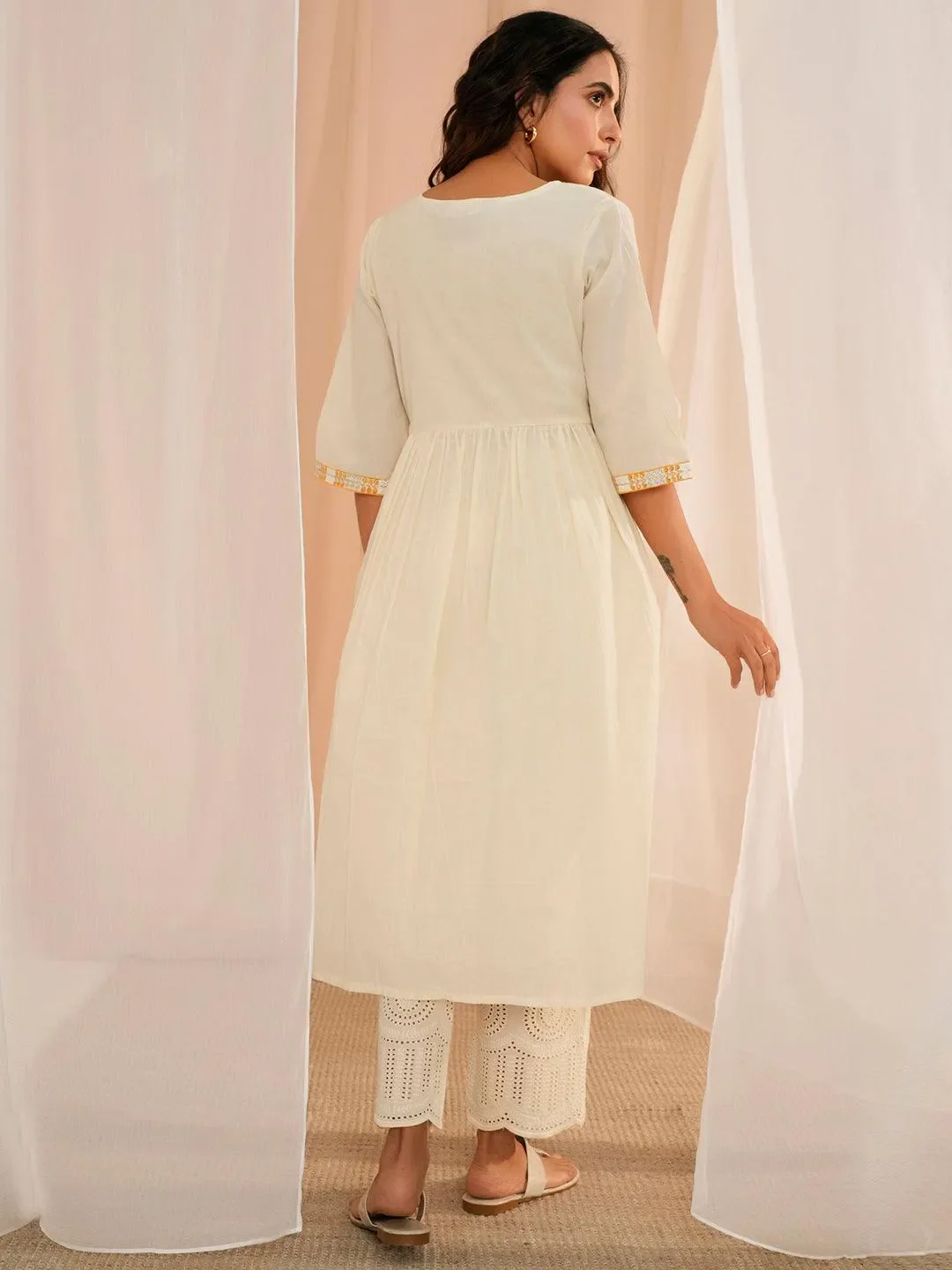 Off White Yoke Design Cotton A-Line Kurta